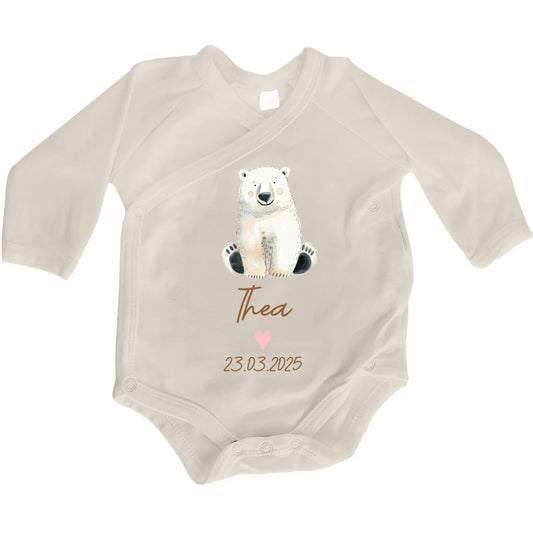 Baby Body Langarm mit Name & Geburtsdatum | Wickelbody aus Bio-Baumwolle | Tierparty - Eisbär