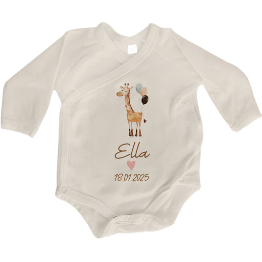 Baby Body Langarm mit Name & Geburtsdatum | Wickelbody aus Bio-Baumwolle | Tierparty - Giraffe
