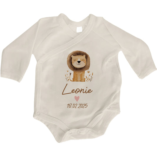 Baby Body Langarm mit Name & Geburtsdatum | Wickelbody aus Bio-Baumwolle | Tierparty - Löwe