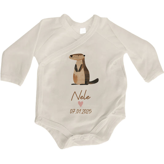 Baby Body Langarm mit Name & Geburtsdatum | Wickelbody aus Bio-Baumwolle | Tierparty - Otter