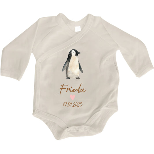 Baby Body Langarm mit Name & Geburtsdatum | Wickelbody aus Bio-Baumwolle | Tierparty - Pinguin