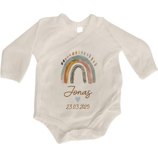 Baby Body Langarm mit Name & Geburtsdatum | Wickelbody aus Bio-Baumwolle | Boho Regenbogen