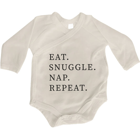Baby Body Langarm mit Spruch | Wickelbody aus Bio-Baumwolle | Eat. Snuggle. Nap. Repeat.