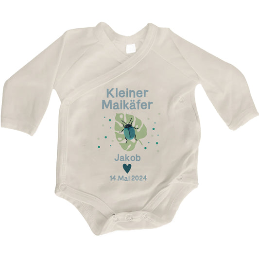 Baby Body Langarm mit Name & Datum | Wickelbody aus Bio-Baumwolle | Kleiner Maikäfer in Blau
