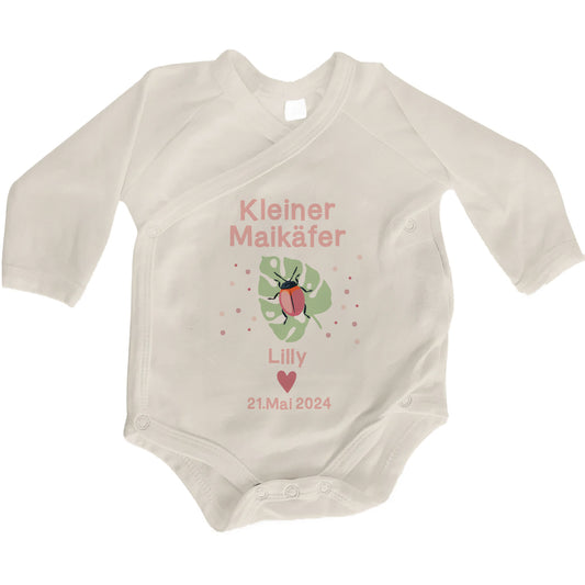 Baby Body Langarm mit Name & Datum | Wickelbody aus Bio-Baumwolle | Kleiner Maikäfer in Rosa
