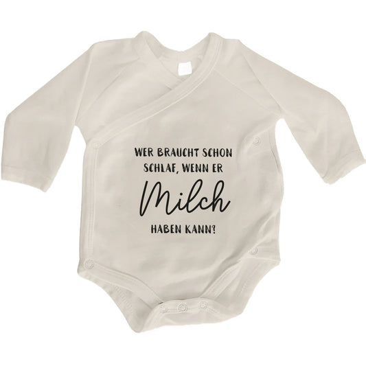 Baby Body Langarm mit Spruch | Wickelbody aus Bio-Baumwolle | Wer braucht schon Schlaf, wenn er Milch haben kann!