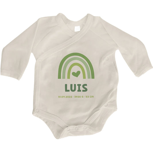 Baby Body Langarm mit Name & Geburtsdaten | Wickelbody aus Bio-Baumwolle | Regenbogen Grün