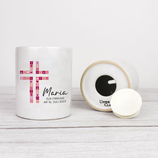 Keramik Spardose mit Name, Datum + Anlass | Kreuz rosa