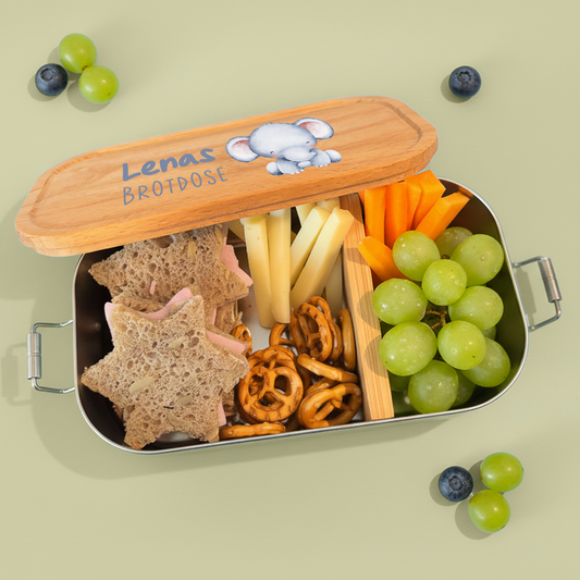 Brotdose | Edelstahl mit Bambus- oder Buchedeckel | 700 ml | Tierkinder Elefant
