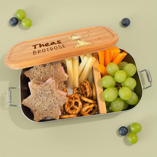Brotdose | Edelstahl mit Bambus- oder Buchedeckel | 700 ml | Tierkinder Giraffe