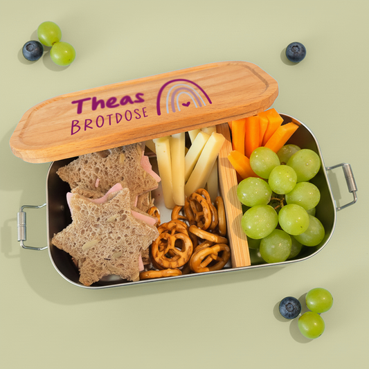Brotdose | Edelstahl mit Bambus- oder Buchedeckel | 700 ml | Regenbogen Lila Herz