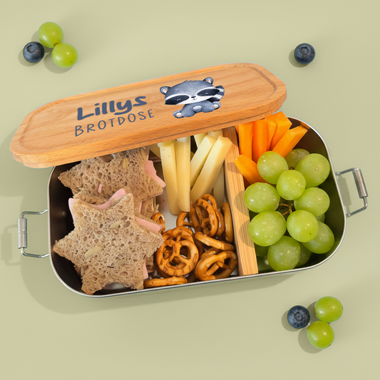 Brotdose | Edelstahl mit Bambus- oder Buchedeckel | 700 ml | Tierkinder Waschbär