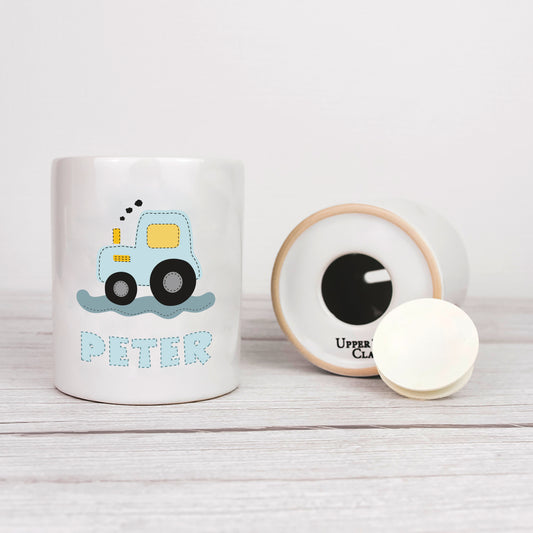 Keramik Spardose mit Name | Traktor blau