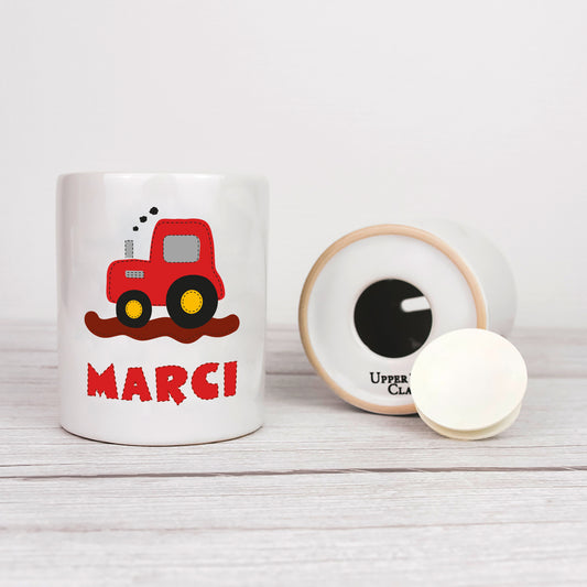 Keramik Spardose mit Name | Traktor rot