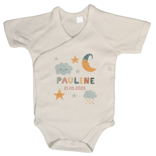 Baby Body Kurzarm mit Name & Geburtsdatum | Wickelbody aus Bio-Baumwolle | Mond & Sterne