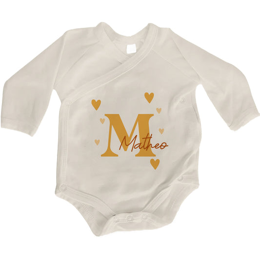 Baby Body Langarm mit Name | Wickelbody aus Bio-Baumwolle | Initiale in gold gelb