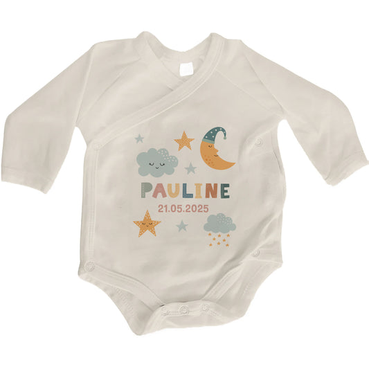 Baby Body Langarm mit Name & Geburtsdatum | Wickelbody aus Bio-Baumwolle | Mond & Sterne