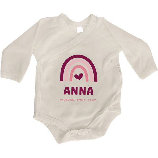 Baby Body Langarm mit Name & Geburtsdaten | Wickelbody aus Bio-Baumwolle | Regenbogen Pink
