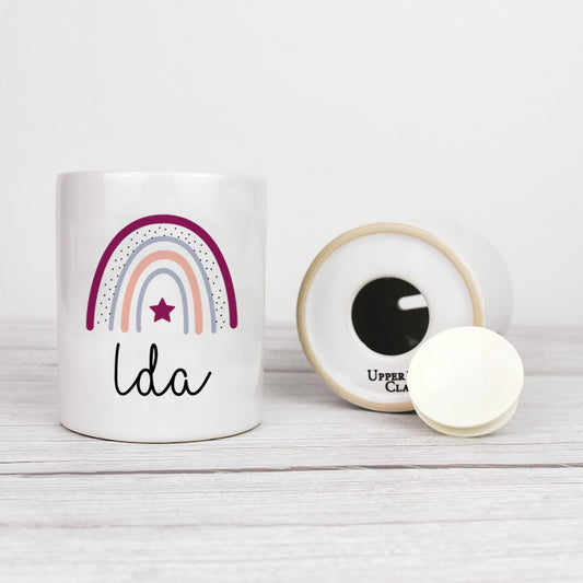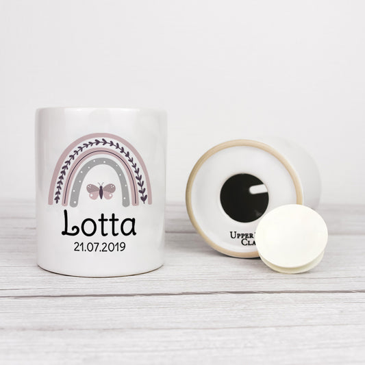 Keramik Spardose mit Name + Datum | Regenbogen rosa