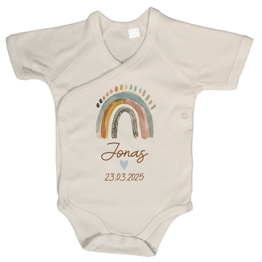 Baby Body Kurzarm mit Name & Geburtsdatum | Wickelbody aus Bio-Baumwolle | Boho Regenbogen
