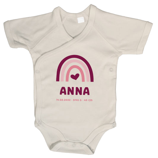 Baby Body Kurzarm mit Name & Geburtsdaten | Wickelbody aus Bio-Baumwolle | Regenbogen Pink