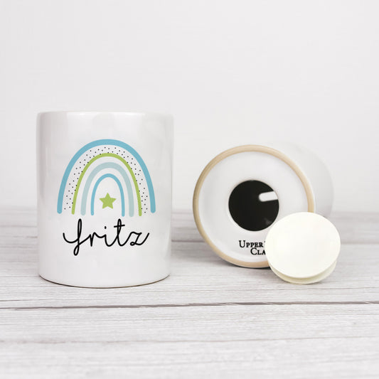 Keramik Spardose mit Name | Regenbogen blau- grün