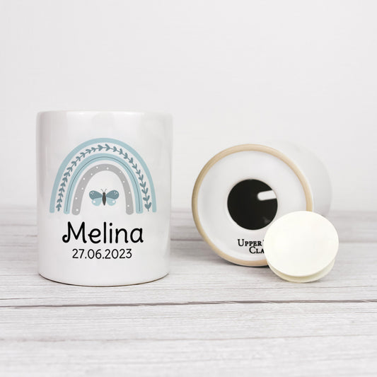 Keramik Spardose mit Name + Datum | Regenbogen mint