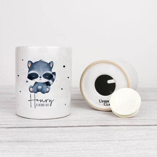 Keramik Spardose mit Name + Datum | Tierkinder - Waschbär