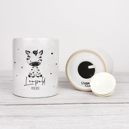 Keramik Spardose mit Name + Datum | Tierkinder - Zebra