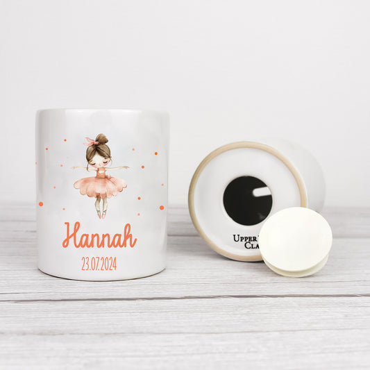 Keramik Spardose mit Name + Datum | Ballerina rosa apricot