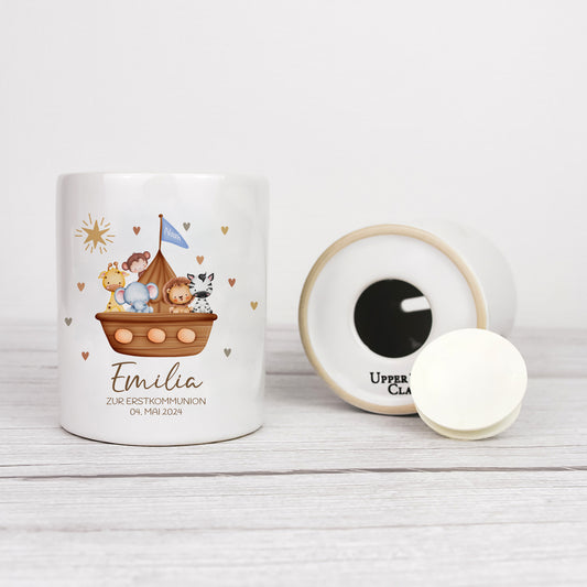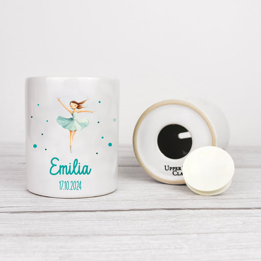 Keramik Spardose mit Name + Datum | Ballerina türkis