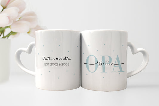 Keramik Herzhenkel Tassen-Set mit Namen + Enkel Geburtsjahr | Oma + Opa