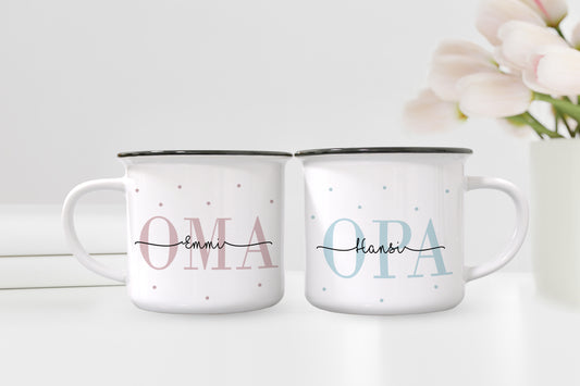 Keramik Emaille-Optik Tassen-Set mit Namen + Enkel Geburtsjahr | Oma +Opa