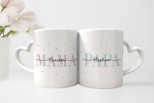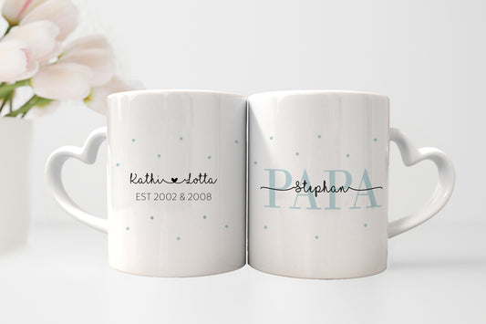 Keramik Herzhenkel Tassen-Set mit Namen + Kinder Geburtsjahr | Mama + Papa
