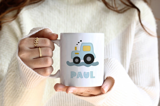 Keramik Tasse mit Namen | Traktor blau