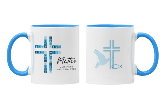Keramik Tasse mit Namen, Datum + Anlass | Kreuz Blau