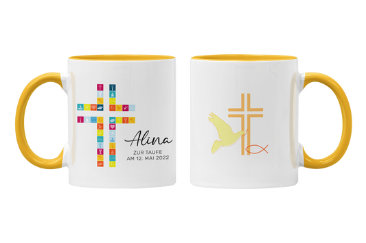 Keramik Tasse mit Namen, Datum + Anlass | Kreuz Bunt