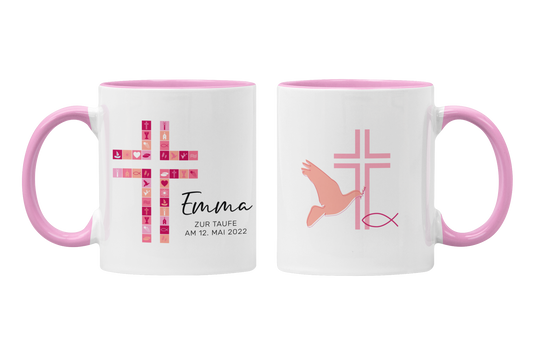Keramik Tasse mit Namen, Datum + Anlass | Kreuz Rosa