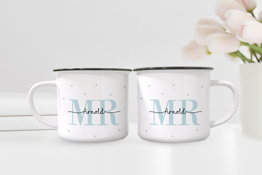 Keramik Emaille-Optik Tassen-Set mit Namen + Datum | Mr + Mr