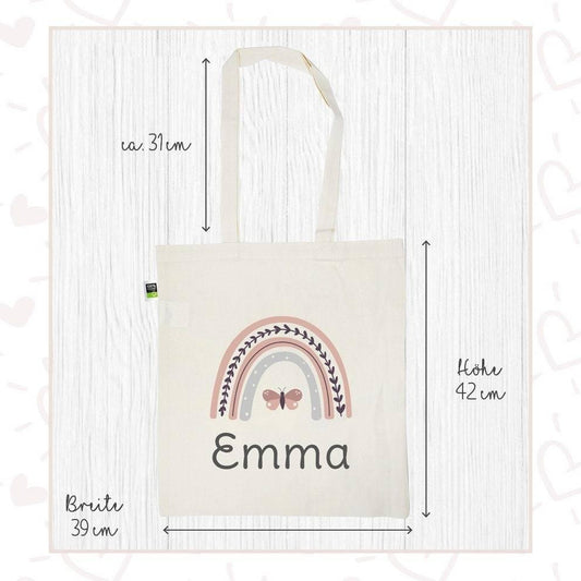 Stofftasche aus Bio- Baumwolle mit Name | Regenbogen rosa + Schmetterling