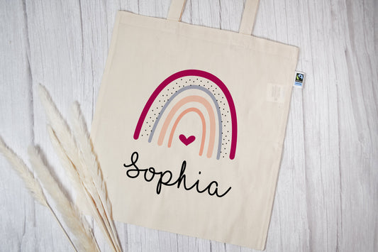 Stofftasche aus Bio- Baumwolle mit Name | Regenbogen Herz