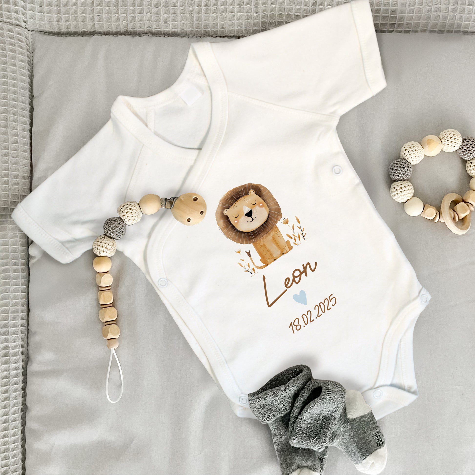Individuelle Personalisierung: Jeder Wickelbody wird mit einem niedlichen Löwen-Motiv bedruckt. Zusätzlich kannst du den Namen deines Babys oder einen anderen Wunschtext hinzufügen. Das Geburtsdatum wird ebenfalls aufgedruckt, sodass der Body eine bleibende Erinnerung an diesen besonderen Tag darstellt. So wird jedes Kleidungsstück zu einem echten Unikat.