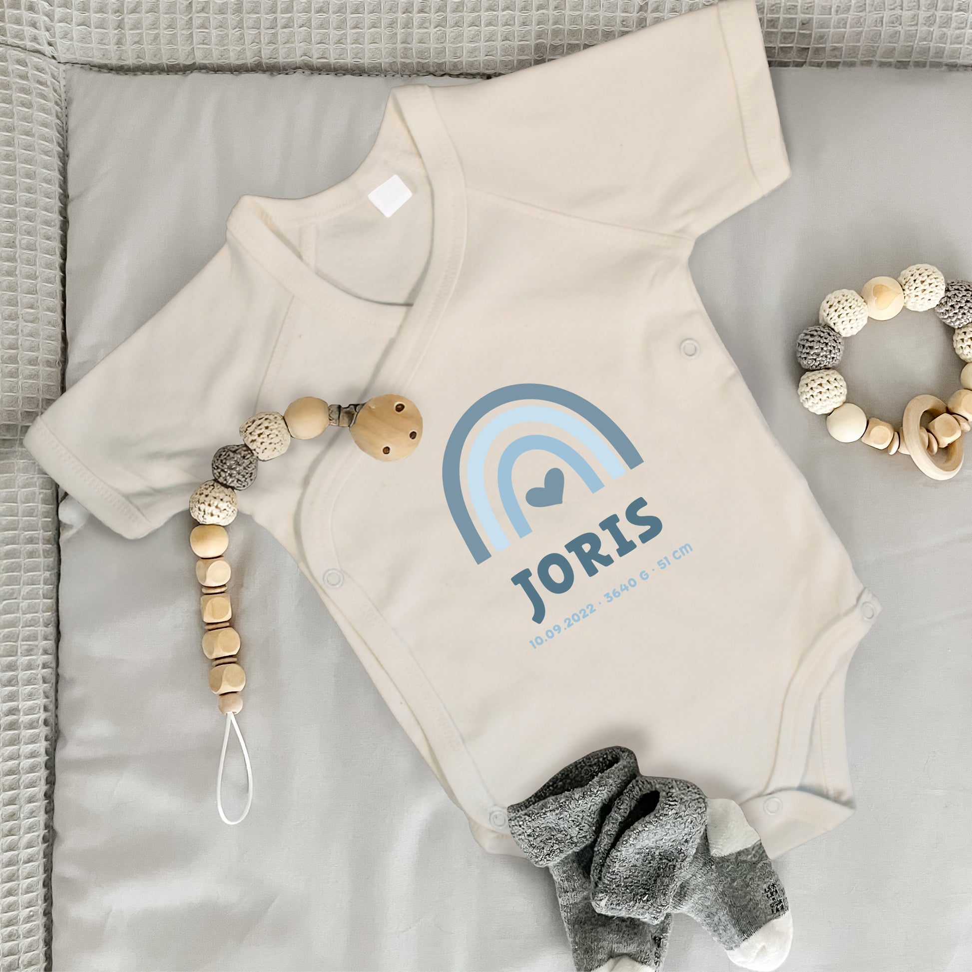 Baby Body Kurzarm mit Name & Geburtsdaten | Wickelbody aus Bio-Baumwolle | Regenbogen Blau
