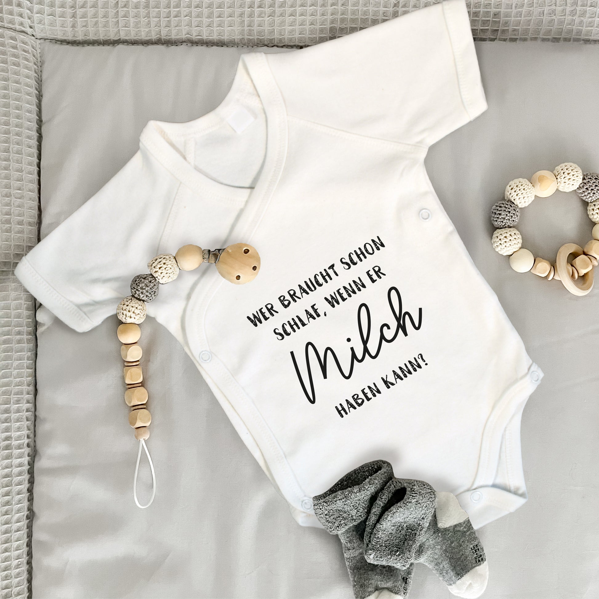 Baby Body Kurzarm mit Spruch | Wickelbody aus Bio-Baumwolle | Wer braucht schon Schlaf, wenn er Milch haben kann!