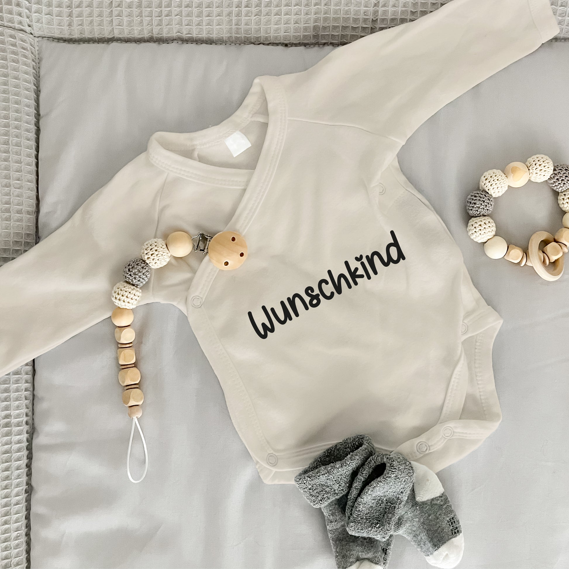 Der Baby Wickelbody ist nicht nur funktional, sondern auch unglaublich stylisch. Das auffällige „Wunschkind“- Design auf der Vorderseite des Bodies ist ein liebevoller Hinweis auf die ungestüme, neugierige Natur deines Babys. Das Design ist modern und schlicht gehalten, sodass der Body sowohl für Jungen als auch für Mädchen geeignet ist.