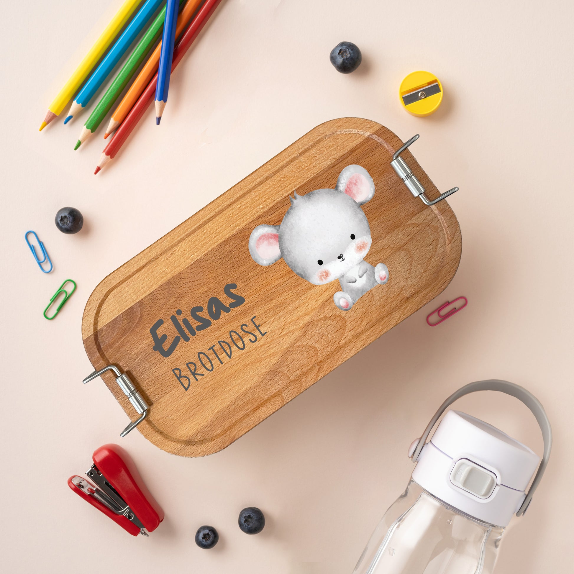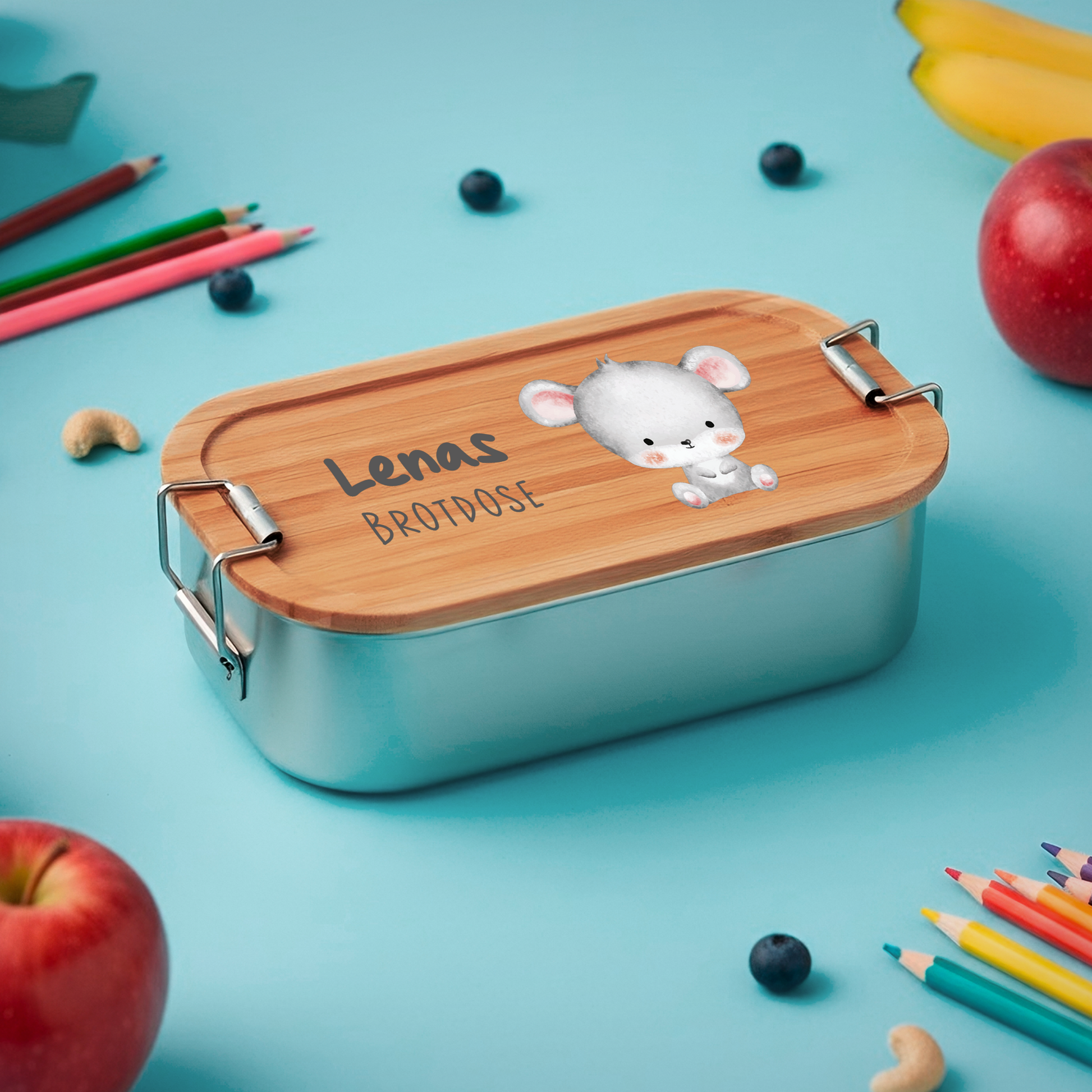 Brotdose | Edelstahl mit Bambus- oder Buchedeckel | 700 ml | Tierkinder Maus