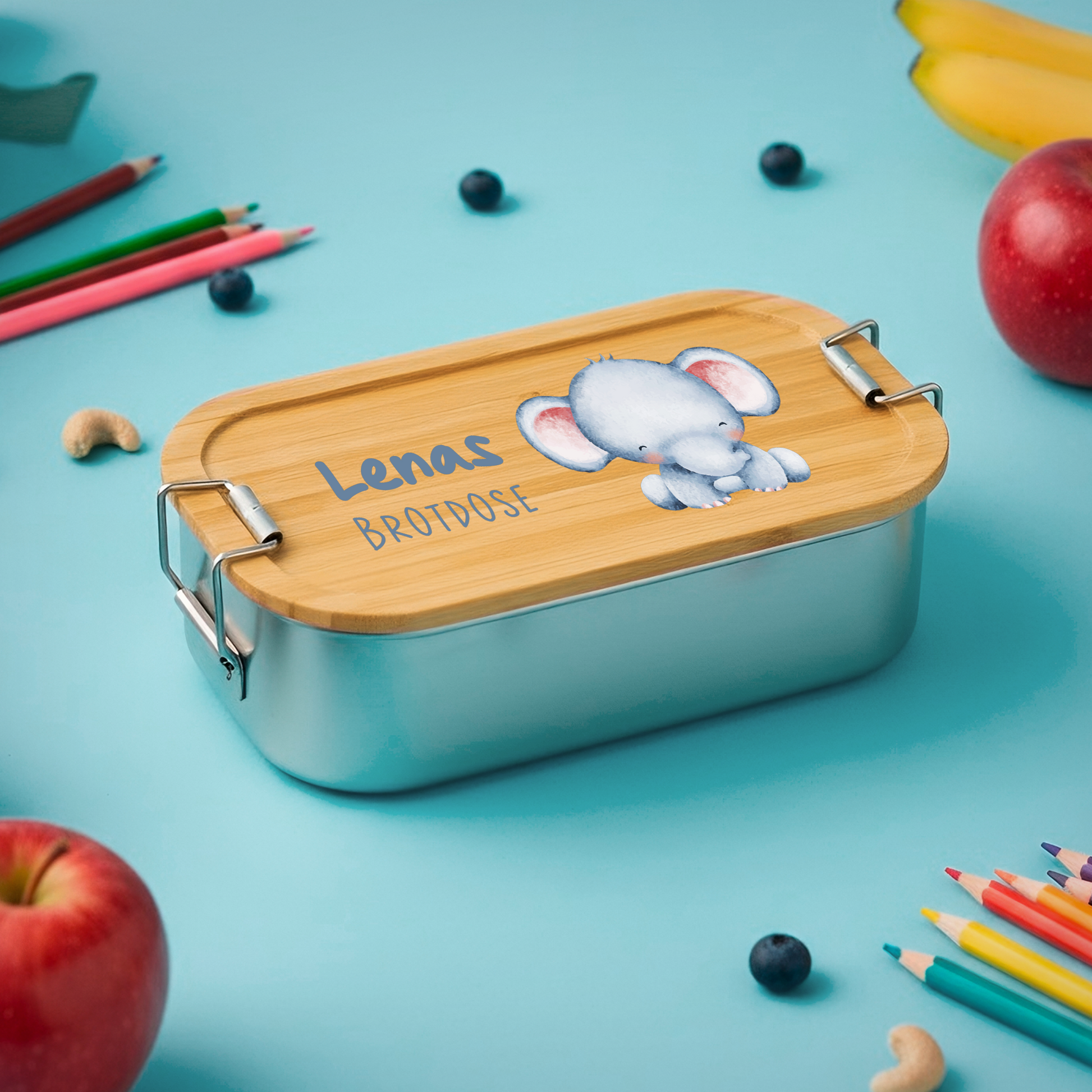 Brotdose | Edelstahl mit Bambusdeckel | 700 ml | Tierkinder Elefant