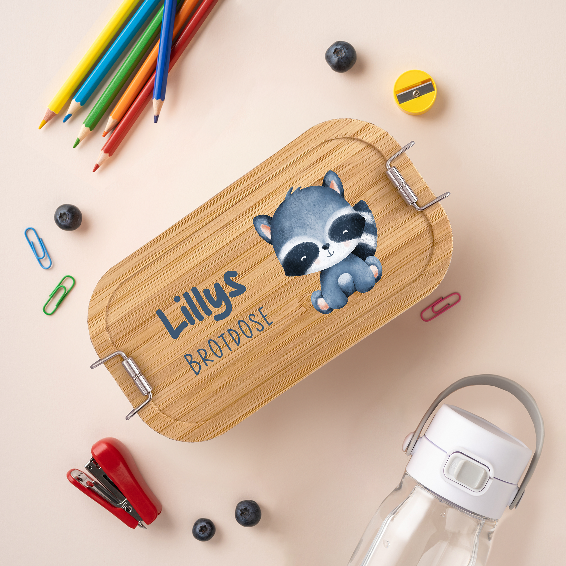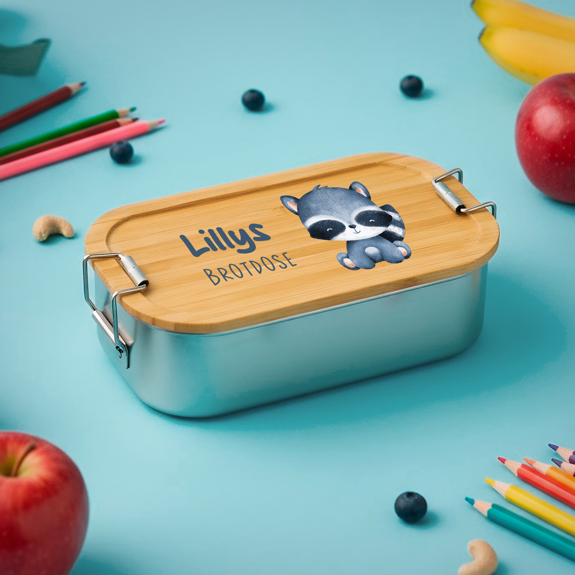 Brotdose | Edelstahl mit Bambusdeckel | 700 ml | Tierkinder Waschbär