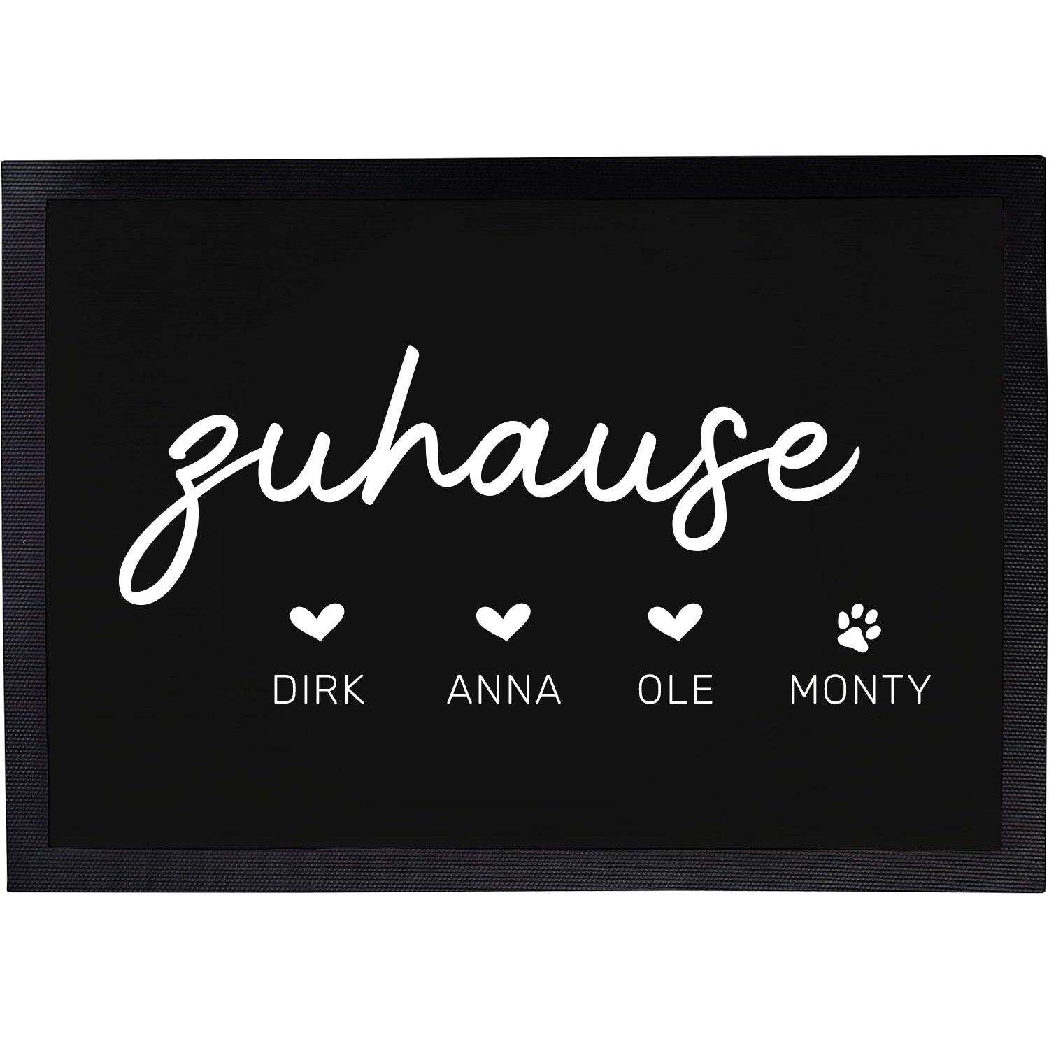 Die Vornamen aller Familienmitglieder sind auf dieser Türmatte unter einem Herz sichtbar, selbst dein Haustier kannst du namentlich unter einem Pfotenabdruck aufdrucken lassen.