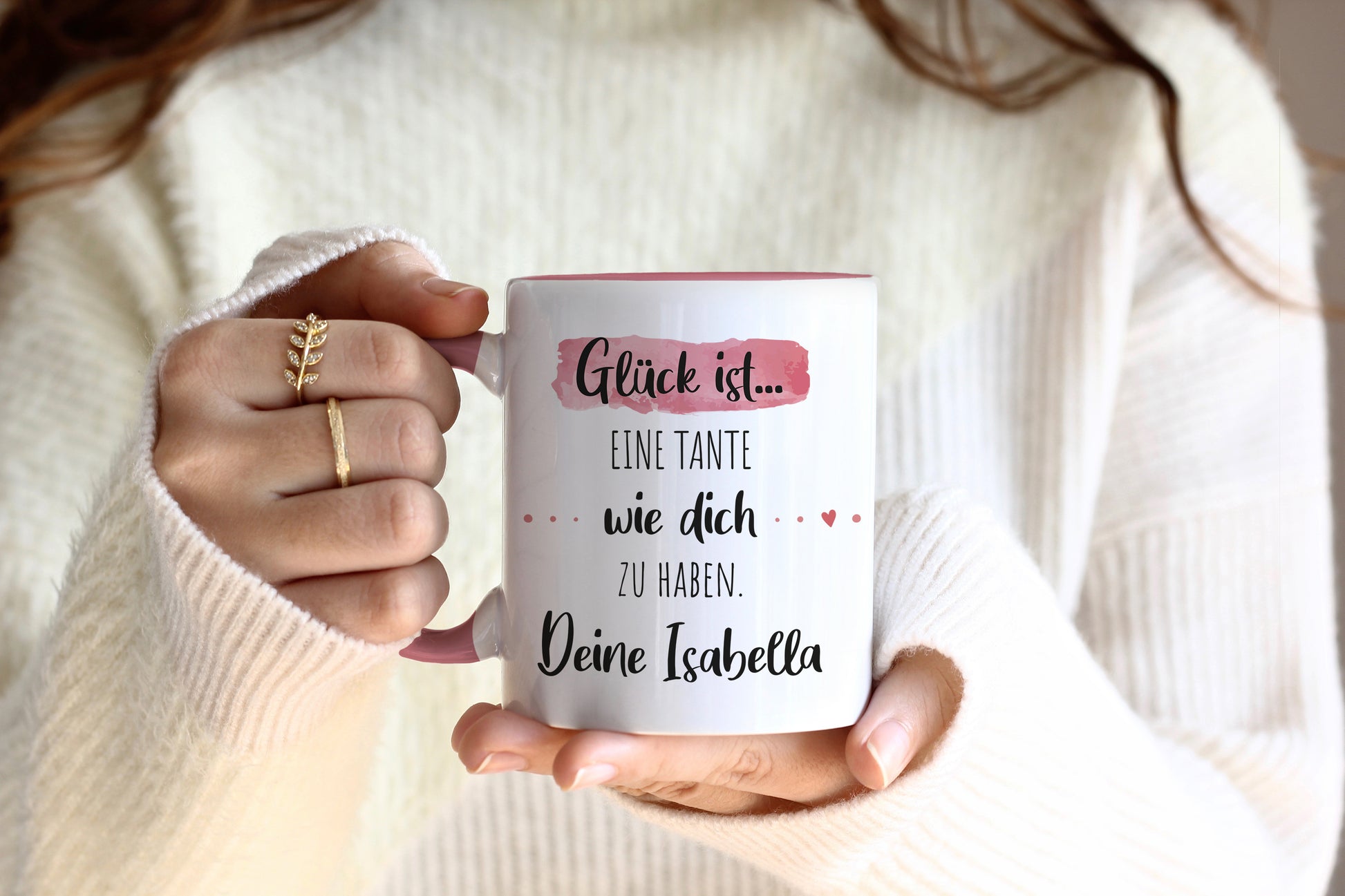 Mit dem Schriftzug „Glück ist eine Tante wie dich zu haben“ und deinem Wunschnamen wird diese personalisierte Tasse zum idealen Geschenk.